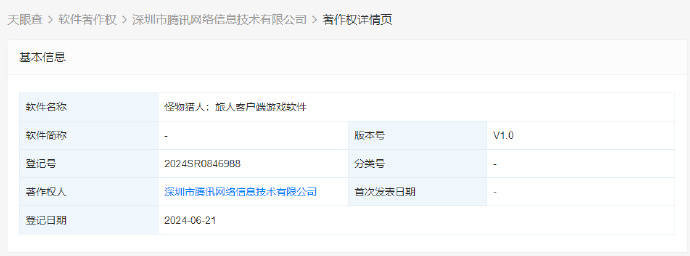 根据天眼查显示,腾讯最近已经完成了新作《怪物猎人旅人》的软件著作权注册。据知情人士Kurakasis透露,这款游戏的英文名称为《Monster Hunter Outlanders》,并有望在今年内正式公布。