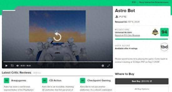 《宇宙机器人》现已发售,一鸣惊人拿到MC94的超高口碑,目前M站已收录113家媒体,依然全员好评。
