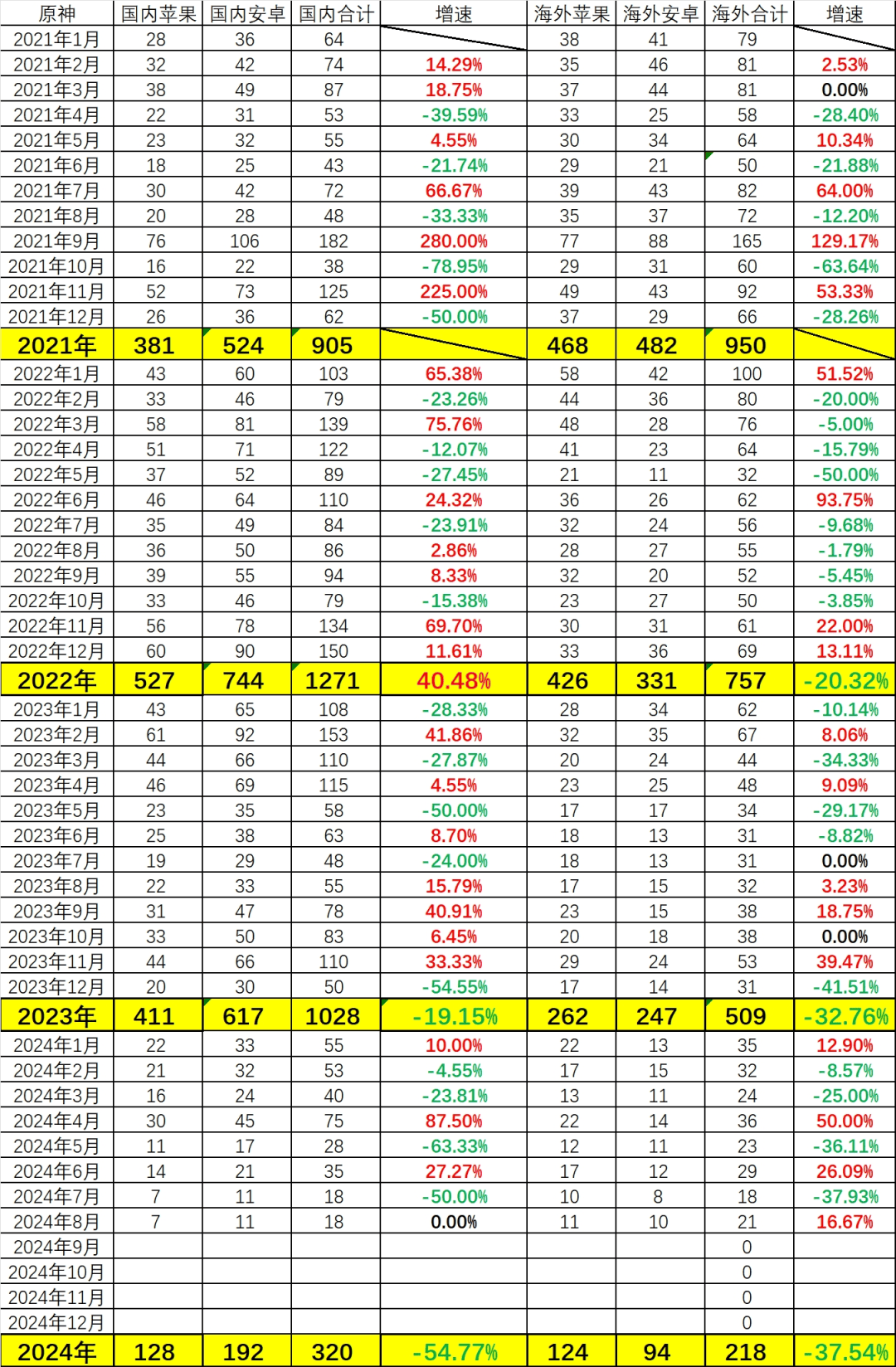 贴吧有网友统计,今年前8个月,《原神》《崩铁》均出现不同程度下滑,其中《原神》前8月国内移动端流水相比去年同期锐减54.77%,海外也大幅下降了37.54%。
