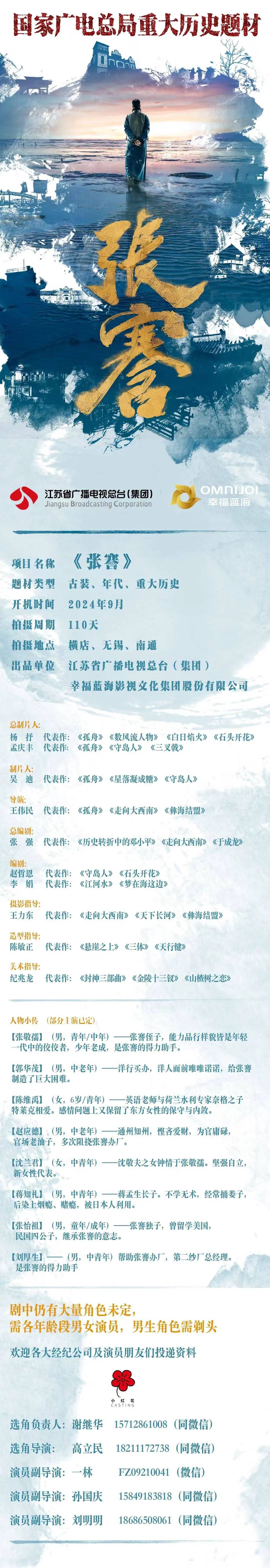 还有各个年龄段众多特约角色,欢迎各大经纪公司和演员老师踊跃投递资料。