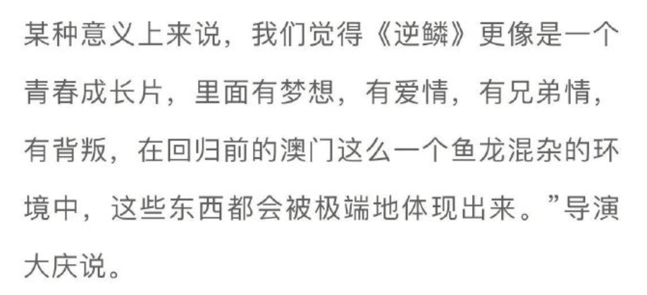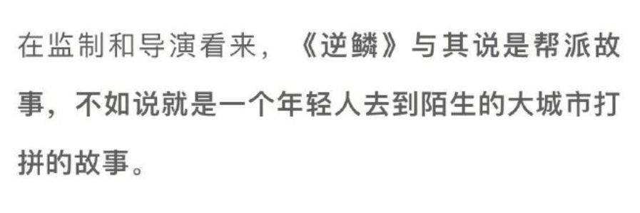 更好笑的是,口碑崩坏到这一步,监制和导演试图摘掉《逆鳞》黑帮和动作的标签。他们在采访中说“《逆鳞》与其说是帮派故事,不如说就是一个年轻人去到陌生的大城市打拼的故事”,并强调“某种意义上来说,我们觉得《逆鳞》更像是一个青春成长片,里面有梦想、有爱情、有兄弟情、有背叛。”