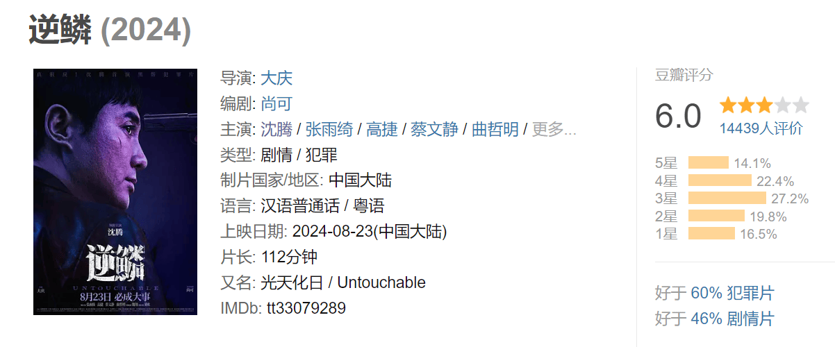 沈腾主演的《逆鳞》上映5天,豆瓣评分跌至6.0,甚至低于《一念天堂》。受口碑影响,电影票房仍未过亿,和《抓娃娃》反差鲜明,这充分证明演员号召力固然重要,但电影品质更重要,而且沈腾目前来说还是要专注于喜剧赛道,毕竟《一念天堂》和《逆鳞》两部非喜剧片票房都不达预期。