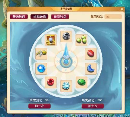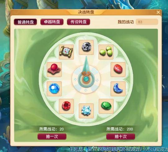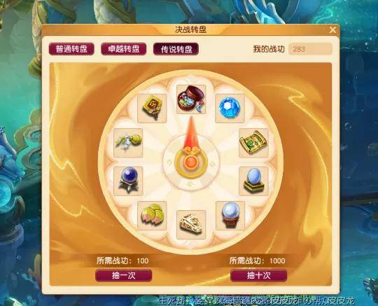 在“深海决战”中拿到战功的小伙伴,还参与决战转盘玩法。决战转盘分为普通转盘(20战功一次)、卓越转盘(50战功一次)、传说转盘(100战功一次)。其中,传说转盘奖励最好,运气好的小伙伴有机会抽到高魔诀奖励哦!