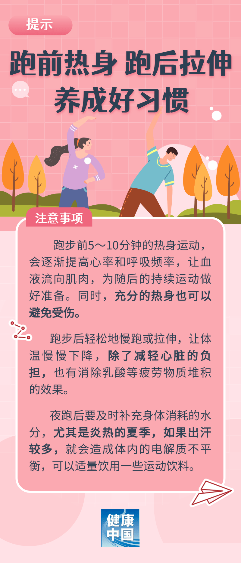 合理安排跑步时间,建立自己的跑步习惯,是一个人能持续跑下去的关键。夜跑的最佳时间段是晚饭后一小时、睡前两小时。跑步的时间太晚,容易造成大脑兴奋,可能影响到睡眠。