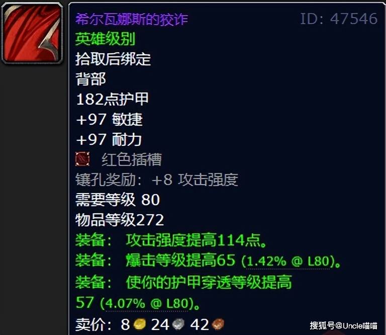 272装等的希尔瓦娜斯狡诈,银色北伐军嘉奖宝箱出品。这东西的甚至喵叔都已经觉得是80级物理系破甲路线的最高标配披风了,还有极品装备都会标配的红色插槽附送8点攻强,真的是物理系职业抢破头,不夸张的说,诸多板甲大佬都会横插一手,绝对是设计师不小心放漏的超模散件,不过掉率非常低,能拿到的绝对是金币兜兜已经放不下,就等出的大佬才能拥有了吧!