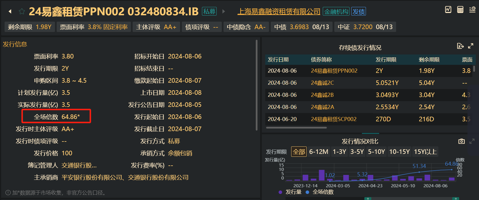 值得注意的是,此前6月20日,上海易鑫融租发行规模2.5亿元、期限270天的超短融资券“24易鑫租赁SCP002”票面利率也达到了3.5%,获得51.34倍全场认购。