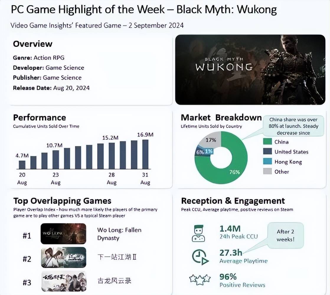 根据VG Insights 的统计,目前《黑神话:悟空》的平均游玩时长已经超过了27个小时。此外,国内销量占总销量的77%,另有6%的销量来自美国,也就是说《黑神话:悟空》的海外销量已经至少达到了23%左右。