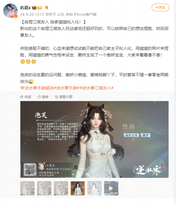 这些玩家利用逆水寒推出的“自捏AI江湖友人”系统,通过输入自己亲人的生平经历、性格特点、还原亲人生前样貌等方式,并利用AI完善细节后,在游戏里再一次见到了自己逝去的故人,并在这一刻真正理解到了AI的含义。