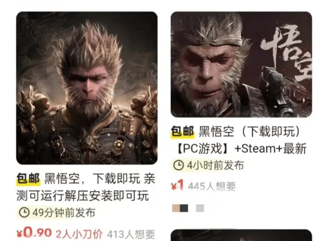 近日,浙江湖州的小蒋在某二手交易平台搜索《黑神话:悟空》的联名周边时发现有不少商家在售卖盗版游戏。这些商品的链接后面基本标注了“下载即玩”字样。有的链接将游戏名称写作“黑神话:孙悟空”,有些则简写为“黑悟空”,大多售价不超过10元,最低1分钱就能“畅玩黑悟空”。