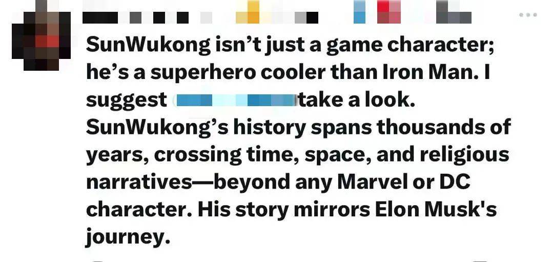 孙悟空不仅仅是一个游戏角色;他是比钢铁侠还酷的超级英雄。我建议马斯克看一看。孙悟空的历史跨越了数千年,穿越了时间、空间和宗教叙事,远超任何漫威或DC角色。他的故事映射了埃隆·马斯克的发迹史。