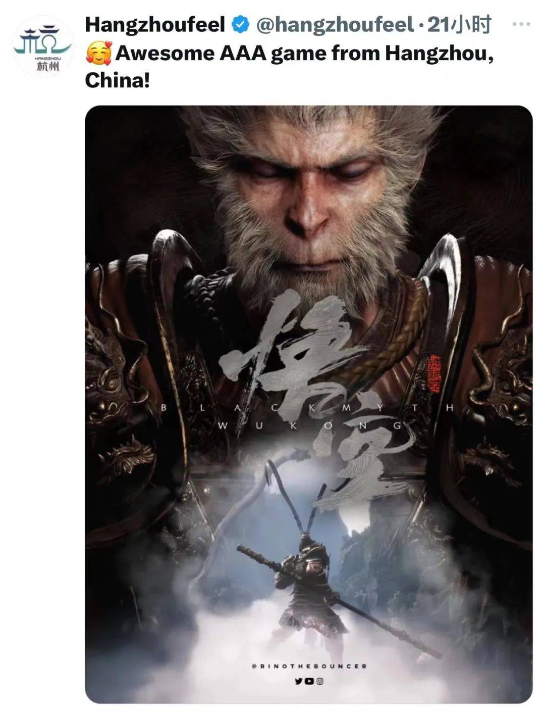 杭州市的海外社交媒体官方账号也在帖子下留言写道:来自中国杭州超棒的3A游戏!