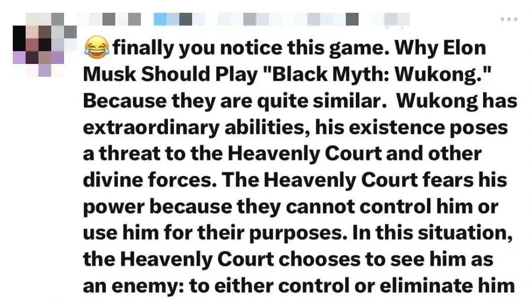 你终于注意到这个游戏了。为什么埃隆·马斯克应该玩《黑神话:悟空》?因为他们有很多相似之处。悟空拥有非凡的能力,他的存在对天庭和其他神力构成威胁。天庭惧怕他的力量,因为他们无法控制他或将其为己所用。在这种情况下,天庭选择将他视为敌人:要么控制他,要么消灭他。