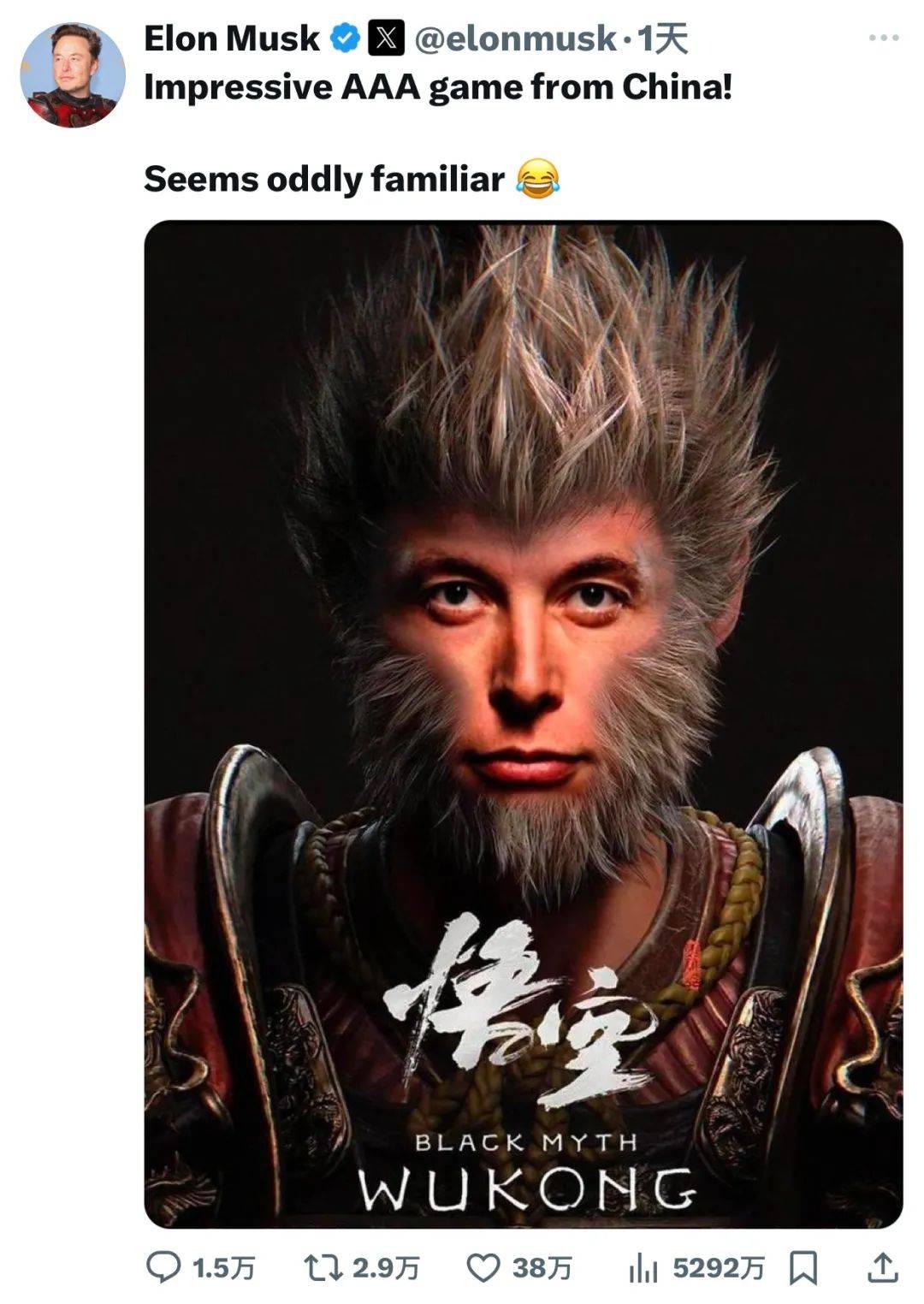 马斯克在社交平台帖子中说到,“来自中国的令人印象深刻的3A游戏!这样看起来就熟悉多了”。这条帖子获得大量的关注,截至发稿,浏览量已经超过5200万次。