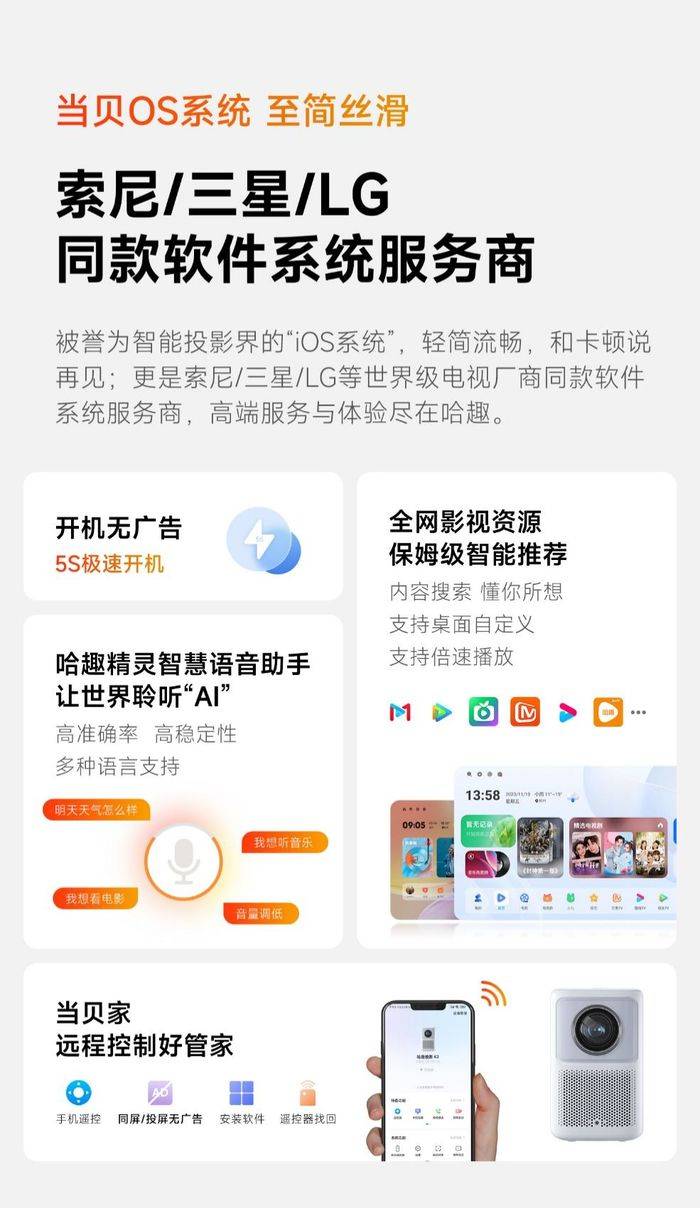 哈趣K2搭载了当贝OS系统,以其简洁流畅的操作体验著称,相当于智能投影领域的“iOS系统”。这款系统轻便不卡顿,与索尼、三星、LG等国际知名电视品牌选用的是同款软件系统服务商,为用户带来高端的服务与体验。哈趣K2开机无广告,仅需5秒钟即可快速启动。配备哈趣精灵智慧语音助手,它不仅具备高准确率和稳定性,还支持多种语言,能够智能推荐全网影视资源,精准捕捉你的观看需求。