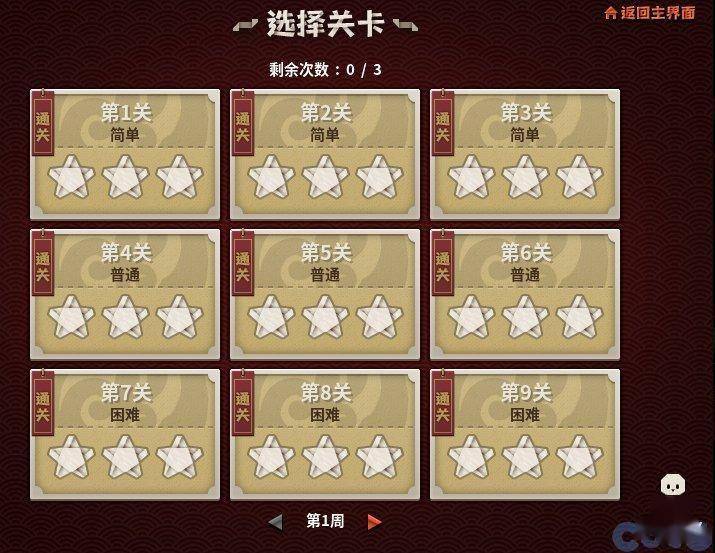 无论成功还是失败,每日有3次挑战机会;关卡按周解锁,每周9个,3种难度各3个,全部3星解锁当周纸片人(用于完成任务)