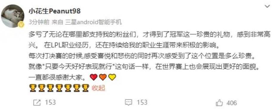 在HLE战队夺冠之后,小花生也是更新了自己的微博,在微博上感谢了LPL赛区,内容是这样的:多亏了无论在哪里都支持我的粉丝们,才得到了冠军这一珍贵的礼物,感到非常高兴,在LPL的职业经历,还在持续对我的职业生涯带来积极的影响。