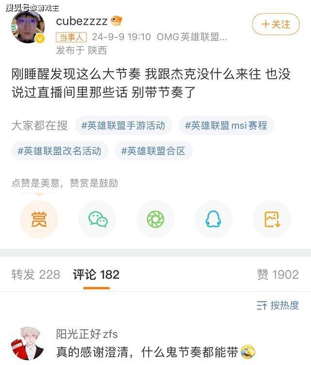 随着事情愈演愈烈,热度也是越来越高,cube本人直接公开回应,和杰克没有太多的来往,自己根本没有说过那样的话,不要再带节奏了。随后OMG首发下路Starry向JackeyLove道歉:很抱歉在今天凌晨与朋友组排聊天时,传播了一些道听途说的不正确言论,产生节奏并对JackeyLove选手造成了不好的影响。在这里我郑重地向JackeyLove选手道歉,对不起。