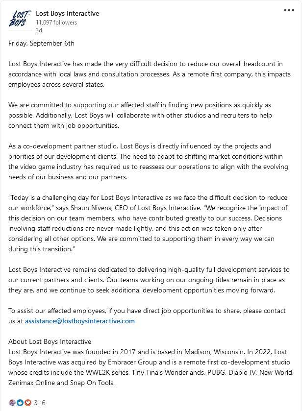 今年早些时候,Lost Boys Interactive 已经进行了一轮裁员,当时原本有 400 人的工作室那一次裁员了 125 人。最新一轮裁员目前尚未公布裁员人数。