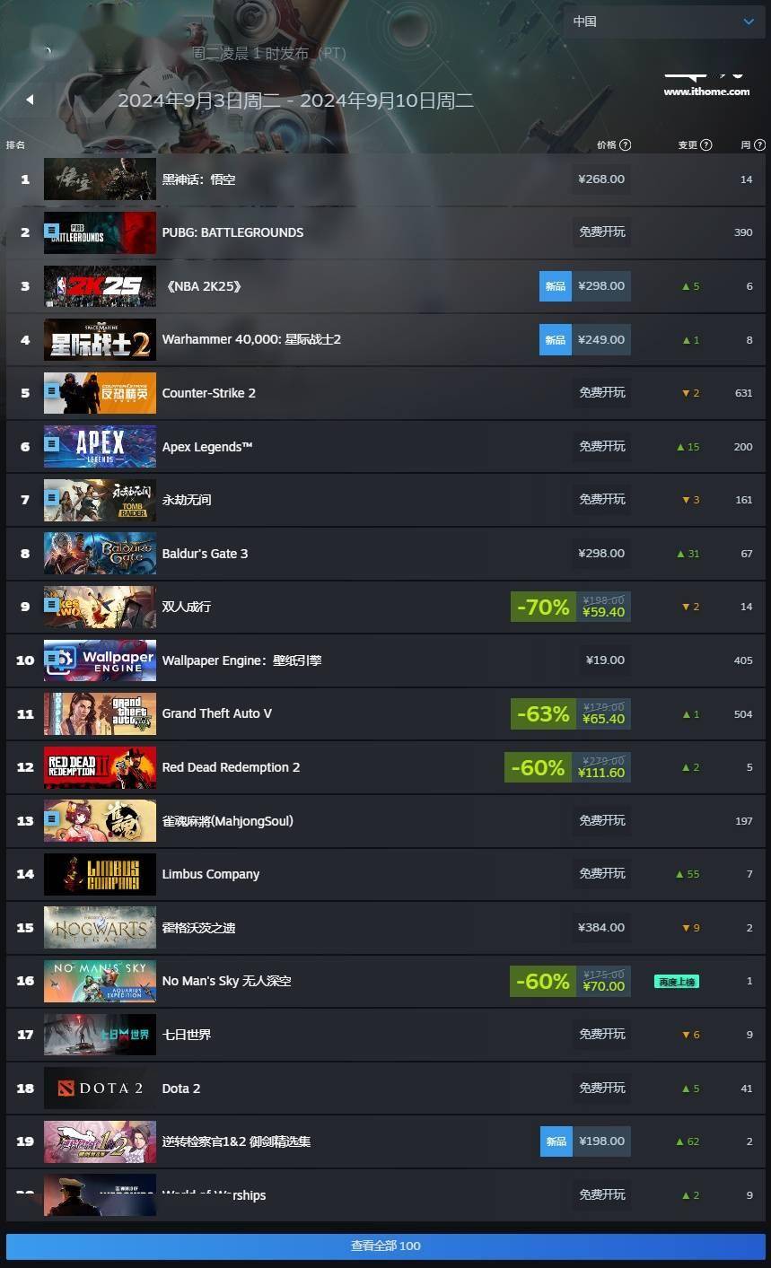 IT之家 9 月 10 日消息,Valve 今天公布了 Steam 平台最新一周销量榜(2024 年 9 月 3 日至 9 月 10 日),《黑神话:悟空》下降至全球第二位,但中国区高居榜首。