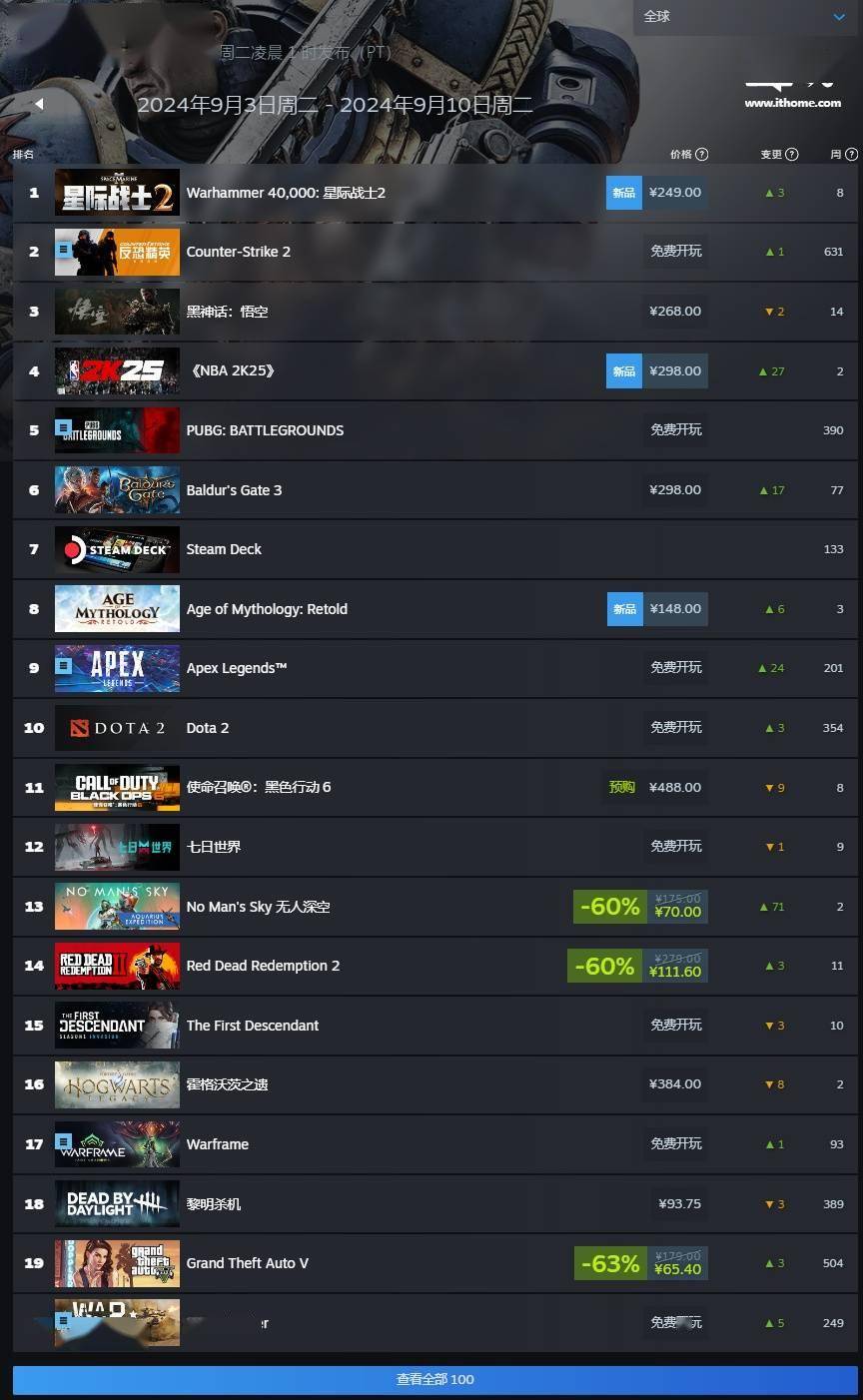 IT之家附 Steam 新一周销量榜(排除免费游戏内容和 Steam Deck):