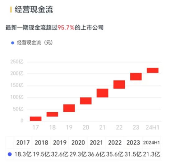 公司能持续赚取真金白银,经营性现金流连续多年稳定增长,今年上半年为21.3亿元。