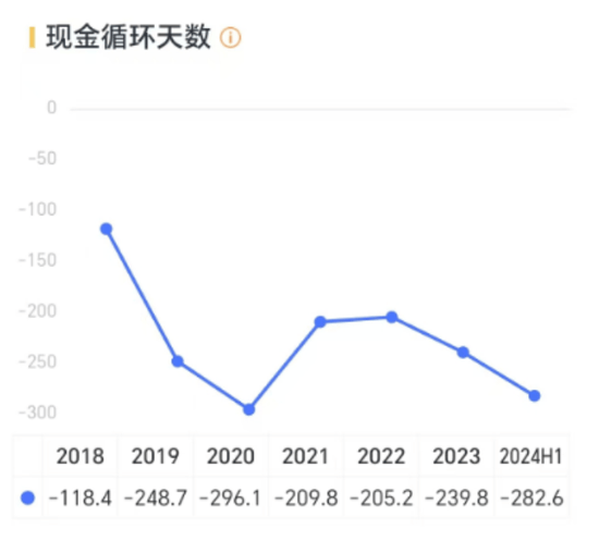 今年上半年,公司的现金循环天数为-282.6天,这种能持续占用上游资金的企业在A股相当罕见。