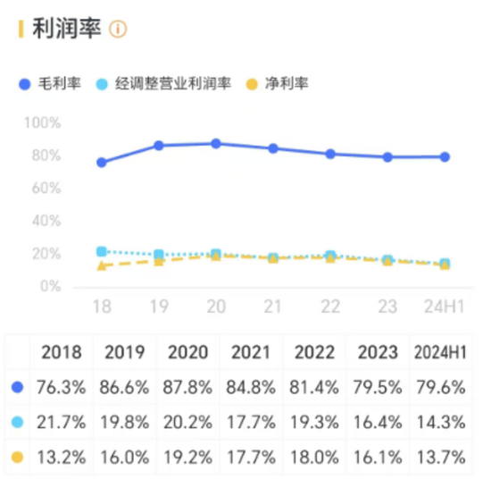 业绩增长的同时,公司的盈利能力总体保持稳健,毛利率和净利率分别为79.6%和13.7%。