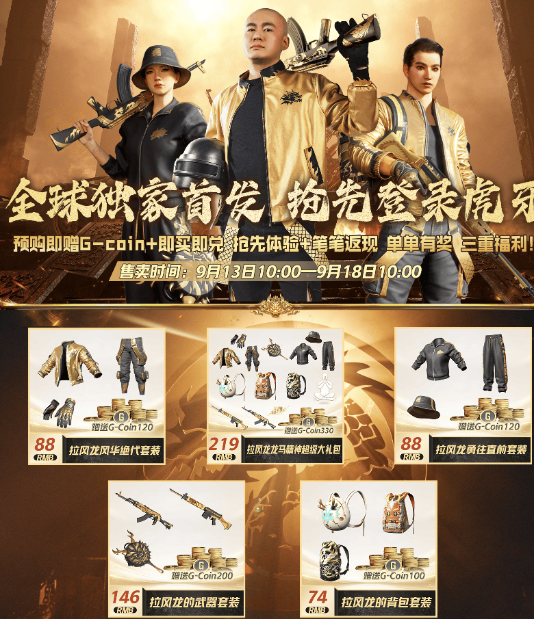 最后关于未央和张凯的世巨A也有瓜传出,那就是队伍即将解散并且退出挑杯,陈穿要去佳美娜,张凯也不会继续带队,当然这只是陈穿的爆料,如果世巨A真的解散,那无疑会有新的队伍递补上,由于挑杯还要一段时间才能开打,究竟世巨A的选手何去何从让我们拭目以待。另外未央和和张凯所在的某牙直播平台,最近也搞出了一个大事件,那就是PUBG拉风龙联名皮肤正式预售,游戏商城是18号才上线,但13号-18号某牙全球首发、独家G-COIN返现、即买即兑、笔笔返现、全网最低价、套装价格超值,性价比彻底拉满了,本次皮肤包含的稀有模板:柏林裤、龙神夹克、东南亚外套、白运动裤、大魔王手套、渔夫帽、龙狙、异型龙蛋包,8种超高价值模版道具包含在一个大礼包内,感兴趣的小伙伴冲就完事了。