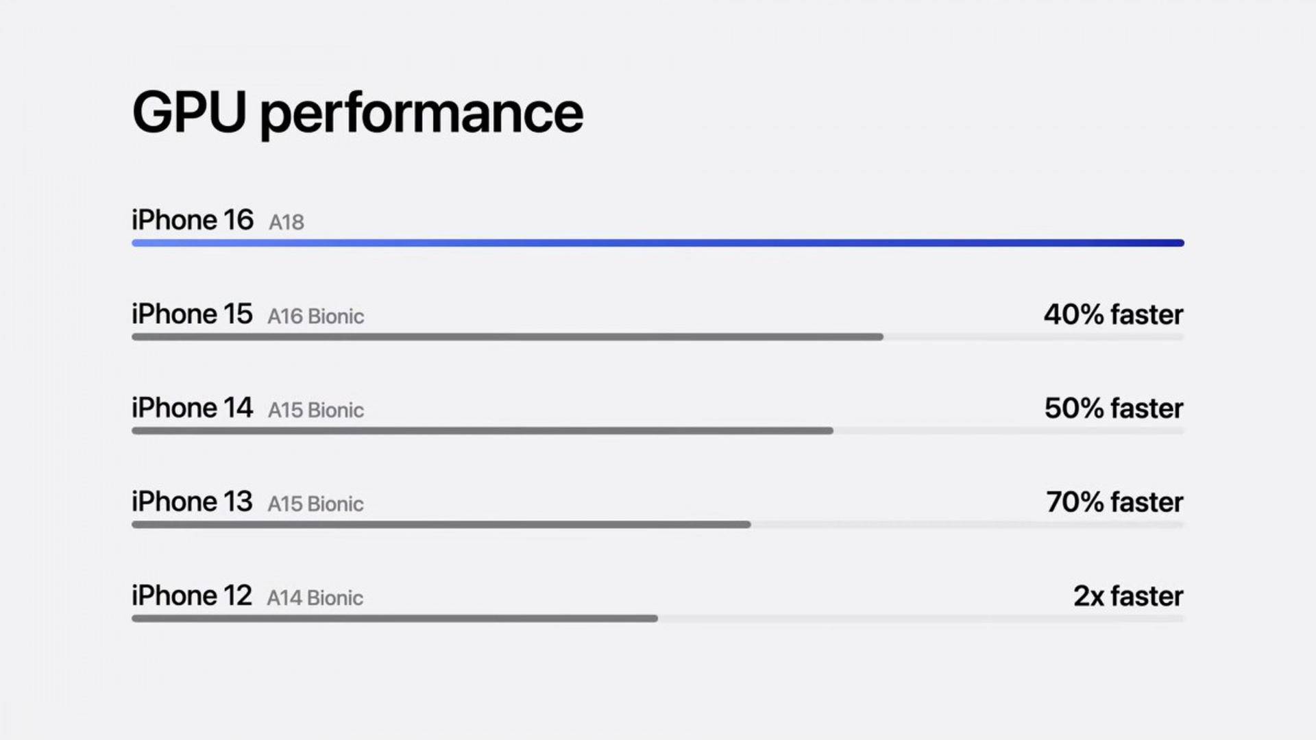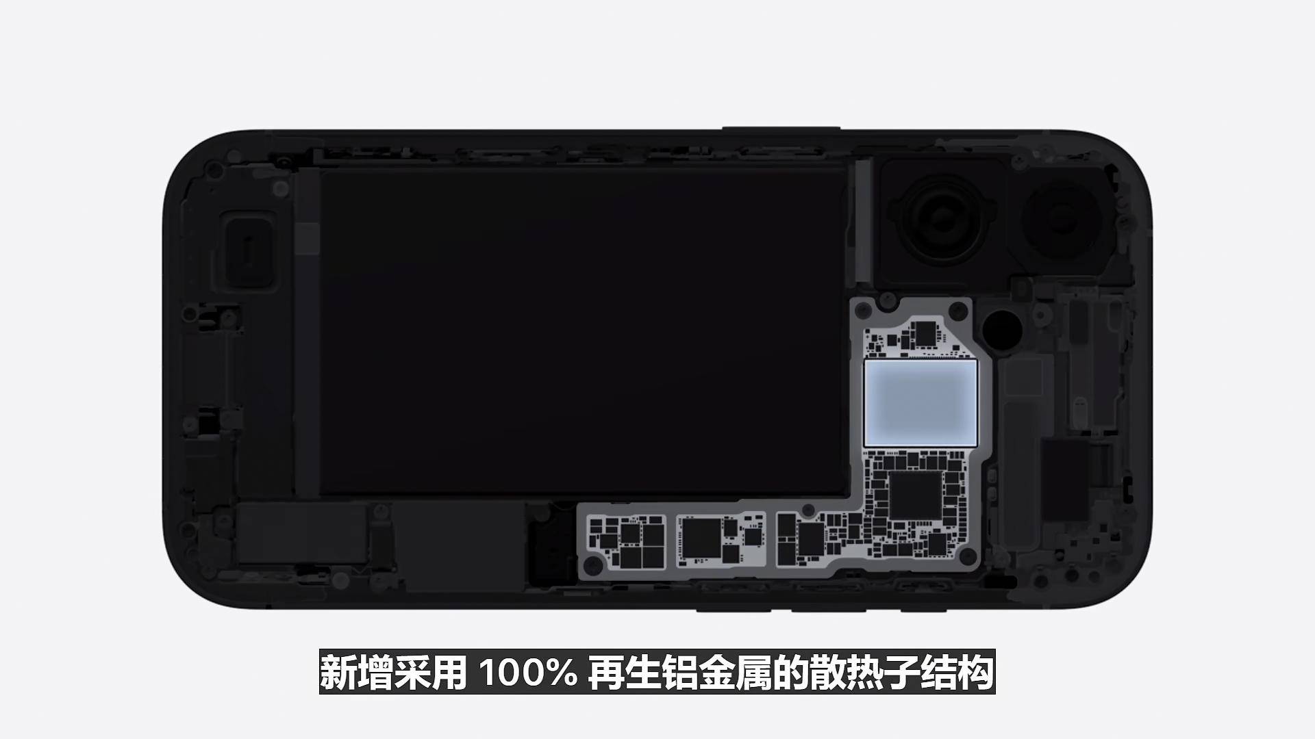 根据苹果官方的说法,这一代iPhone 16所搭载的A18处理器采用了16核神经网络单元,台积电3nm工艺,功耗相比上代搭载的A16芯片下降了30%,再加上采用了全新的散热设计,芯片居中放置,以及铝金属的散热子结构,使得整体的散热能力提升了30%,游戏持续性能提升也达到了30%。