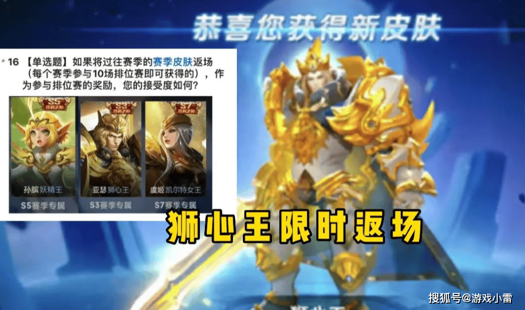 接下来就不得不提亚瑟这位英雄了,亚瑟的狮心王这款皮肤,也要迎来一波返场了,主要的返场方式,据悉是赛季商城进行领取的,不出意外的话,应该会在下一个赛季商城之中,毕竟眼看今年即将结束,在z后一个赛季之中,必然要上新一些福利,所以应该亚瑟的狮心王就会在此期间迎来返场,作为给予玩家们的重磅福利,领取到赛季入场券之后,可在赛季商店之中进行获取,毕竟亚瑟的狮心王前几年就有官方的调研,调研活动有许多玩家期待再次的返场,所以这下终于要来了,对于新玩家们来说是喜事,毕竟当初能够入手狮心王的玩家少之又少。