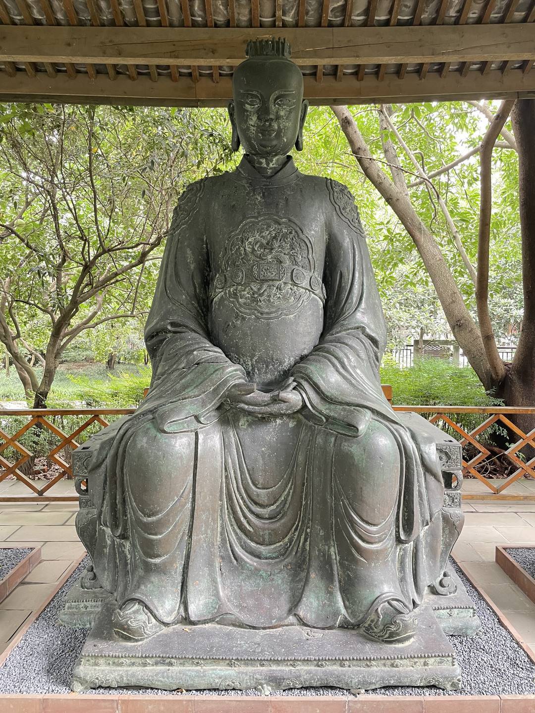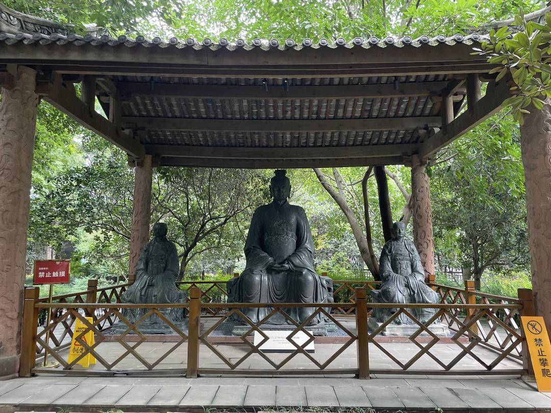 铜像为何会在这里呢?四川省地球物理调查研究所副所长李忠东介绍,这三座铜像原本在成都江渎庙中,1911年庙被拆了,改建为南城小学,庙内文物四散,而江渎神及两位神姝的铜像在1924年移至少城公园(今人民公园)收藏,上世纪50年代转交至四川博物院。最终,2009年随四川省博物院迁至浣花溪畔,从此在这“安了家”。
