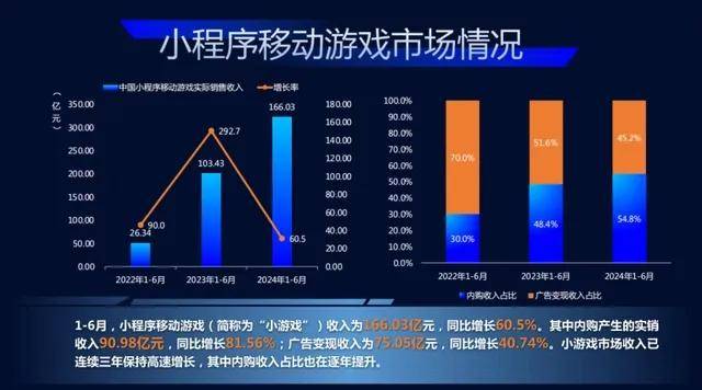 被苹果忽略的小游戏机会,这两年却被中国厂商狠狠地抓住了。根据伽马数据发布的《2024年1-6月中国游戏产业报告》,今年上半年小游戏实销收入为166.03亿元,同比增长60.5%。其中内购产生的收入为90.98亿元,同比增长 81.56%,在总收入中占比首次超过50%。