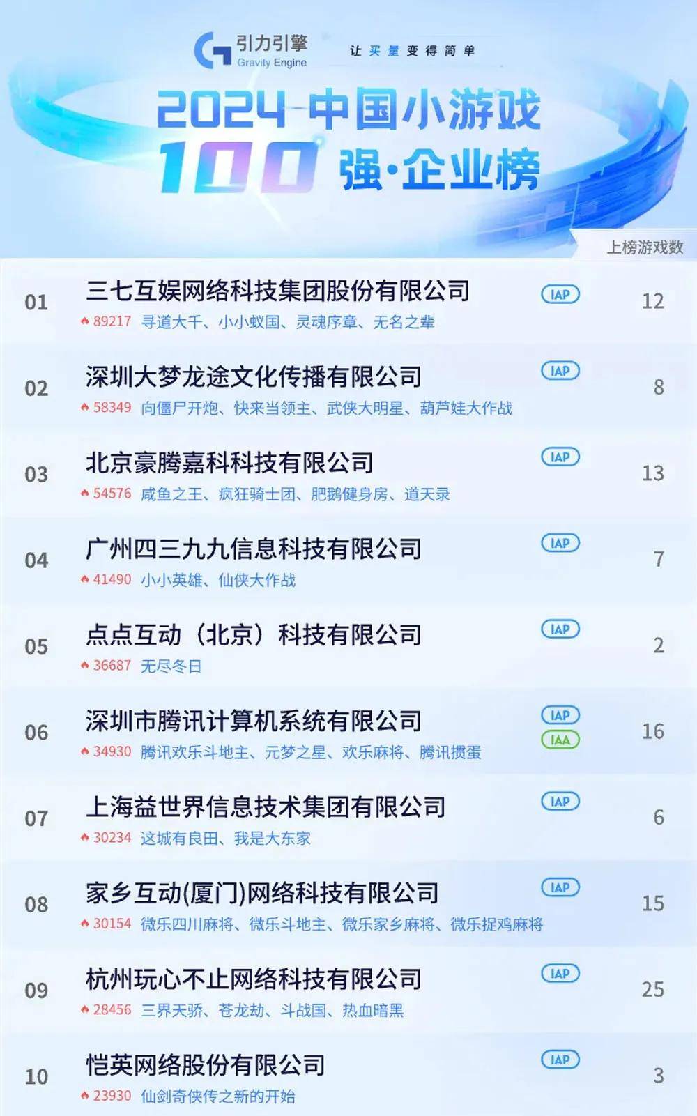 9月5日,引力引擎发布了一份《2024年中国小游戏百强企业榜》,基本上把国内小游戏势力版图勾勒了出来。