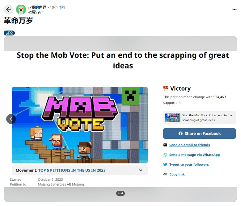 去年10月生物投票活动开始前,玩家社区的反抗情绪来到了顶点,change.org上“请《我的世界》取消生物投票”的联名请愿活动,在短短3天内得到了20万名玩家支持,但这仍然没能阻止当年生物投票的到来。