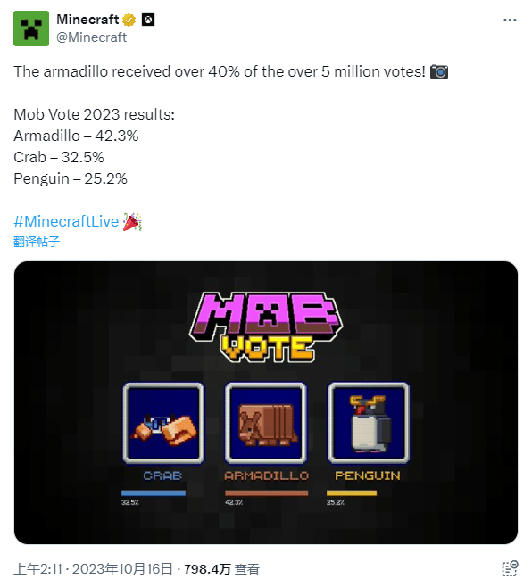 另外一方面,通过过去的生物投票数据很容易发现,“只能三选一”的投票形式,实际上是个最容易创造“让大多数人都不满意的局面”的机制:比如在去年的投票中,犰狳以42%的得票率踏进了《我的世界》的大门,然而,这同时意味着58%的玩家并不欢迎它的到来。