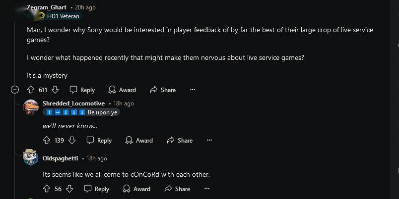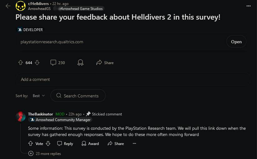《绝地潜兵2》开发商 Arrowhead 通过 Reddit 论坛最先分享了该问卷。社区经理 Baskinator 表示:“这项调查是由 PlayStation 研究团队进行的。当调查收集到足够的回复时,我们将删除此链接。”目前该调查显然已经完成。