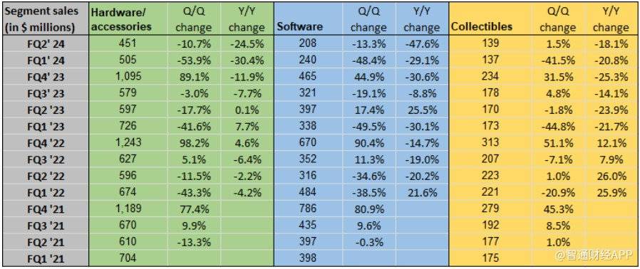 硬件、软件和收藏品的销售额均较上年有所下降。具体来看,硬件销售额同比下降24.5%,至4.51亿美元;软件销售额同比下降47.6%,至2.08亿美元;收藏品销售额同比下降18.1%,至1.39亿美元。