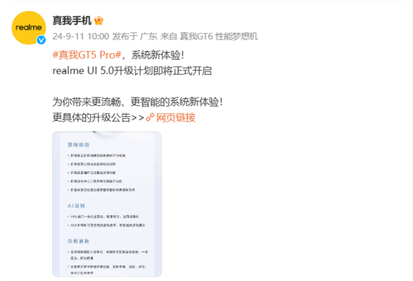 快科技9月11日消息,今日,真我手机官方公布了真我GT5 Pro手机realme UI 5.0的升级计划。