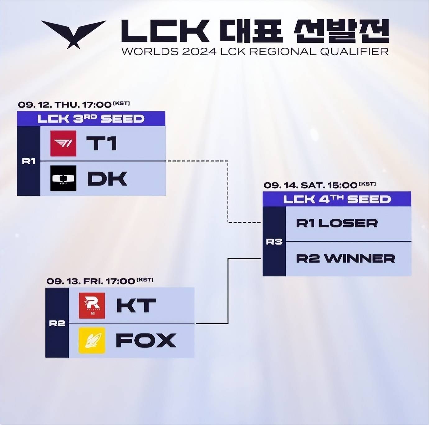 LCK赛区可能是全世界决出S赛名额最慢的赛区,随着夏决的落幕,LCK赛区的三、四号种子,仍需通过9月12日开始的冒泡赛来确定最终的名额。目前,败者组的对阵情况为KTvsFOX、胜者组的对阵情况为DKvsT1。