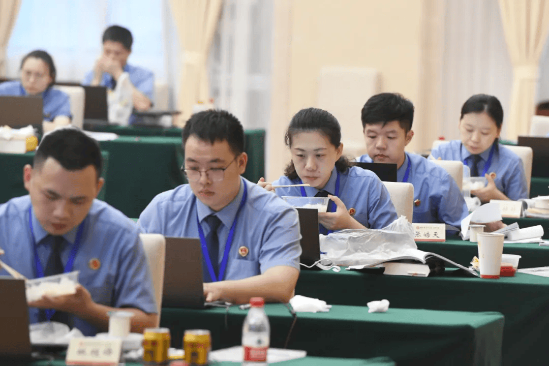 参赛选手分秒必争,在赛场用餐 。