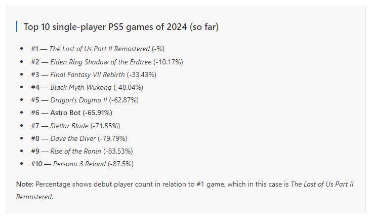 即便如此,《宇宙机器人》在目前为止的数据统计中,来到了2024年10款最佳单人PS5游戏的第6位。
