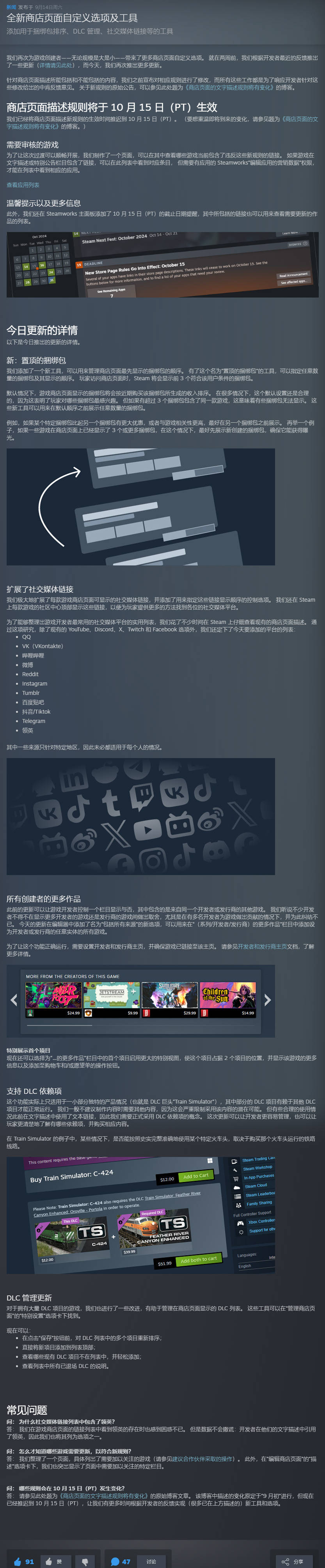此外,官方还添加了一个新工具,可以用来管理商店页面最先显示的捆绑包的顺序;展示来自同一个开发者或发行商的更多作品,并特别展示首个项目;让开发者可以标注其中部分的 DLC 项目有赖于其他 DLC 项目才能正常运行;DLC 管理更新等功能,所有具体更新功能看最后一张图。