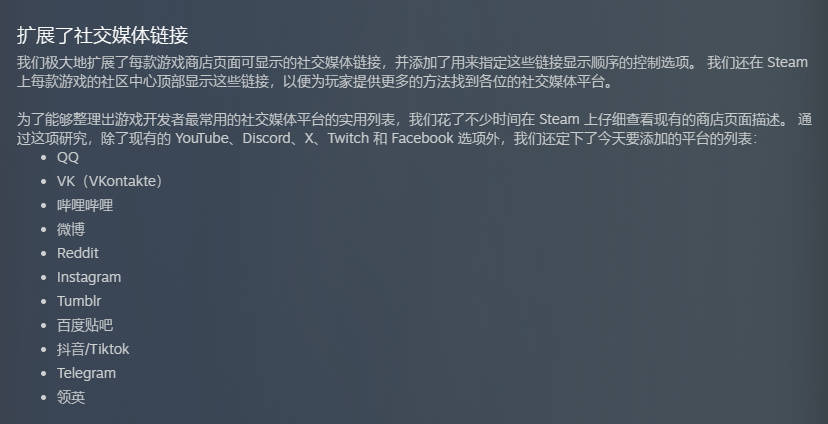 Steam今日更新了开发者的全新商店页面自定义选项及工具,宣布官方扩展了每款游戏商店页面可显示的社交媒体链接,除了现有的 YouTube、Discord、X、Twitch 和 Facebook 选项外,开发者现在可以添加QQ、VK(VKontakte)、哔哩哔哩、微博、Reddit、Instagram、Tumblr、百度贴吧、抖音/Tiktok、Telegram和领英链接。