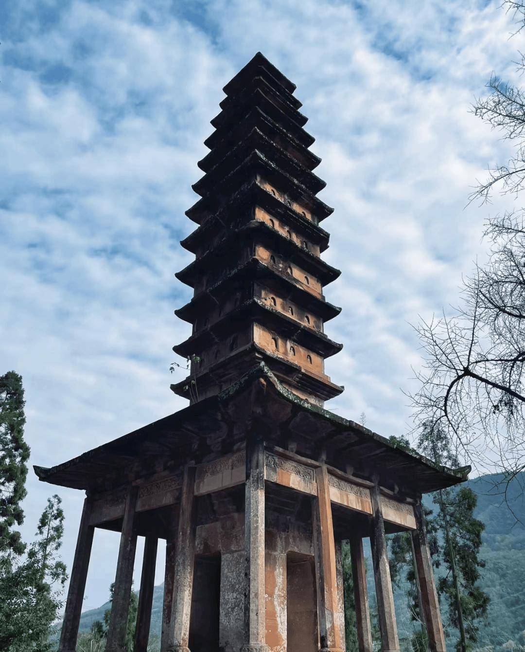 塔由红砂石砌筑而成,平面呈正方形,通高17.8米,攒尖形顶13级密檐式。