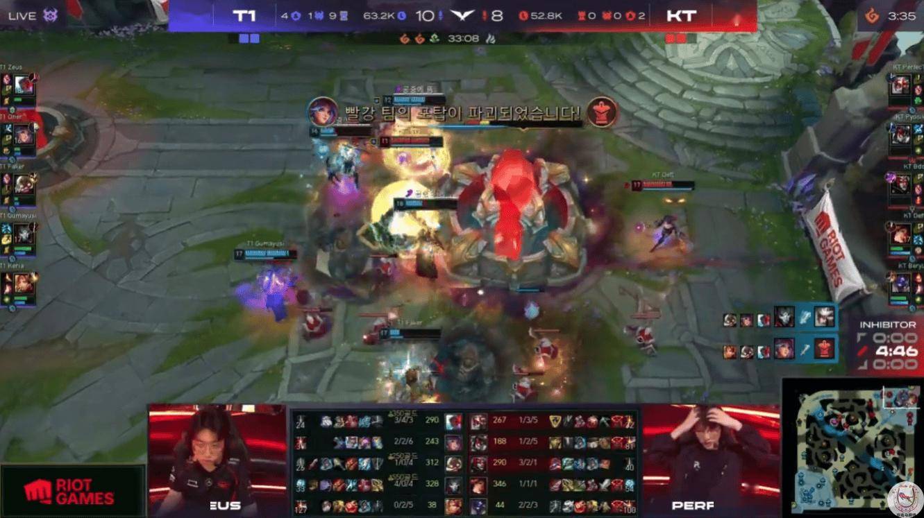 总的来说,这场Bo5能够打满也确实很离谱。因为KT家的新人上单Perfect完全是白给的,能力和经验都很差,只有玩肉的时候还算有点用。不过因为BDD这两天状态不错,而且T1前几局没针对永恩,结果双方还是打满了。T1最后抢永恩前期表现并不理想,但是上路一波猪妹绕后被黏住,KT昏了头全队为了救他原地反打被永恩大了个满堂彩,结果T1一波小团灭加大龙锁定胜局。
