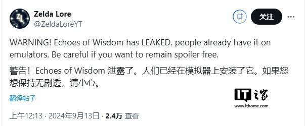 IT之家注意到,另一位专注于塞尔达系列的内容创作者 Zelda Lore 也在社交媒体上证实了《塞尔达传说:智慧的再现》ROM 文件泄露的消息,指出“人们已经在模拟器上体验了这款游戏”。