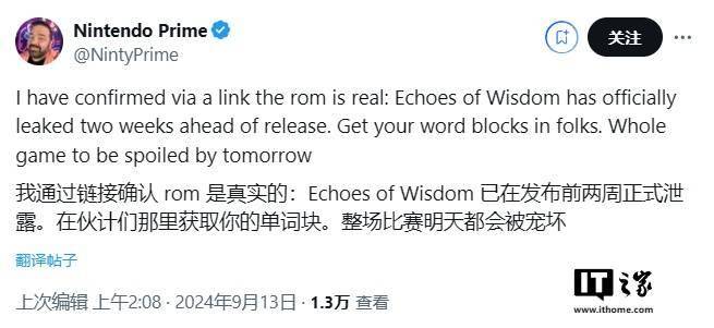 知名游戏主播 Nintendo Prime 在 YouTube 视频中表示,他们“已经确认”这是真的。并且在另一段视频中,Nintendo Prime 表示他们对收到的链接进行了检查,确认“这就是《智慧的再现》的 ROM”。