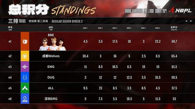接着第四场BBE再拿大分,虽说第五把发挥不佳,但是第六把BBE再次上演完美的剧本。在拿到地脉仪的玄武之力后,BBE主动求战成为决赛圈的搅局者,OUG再次不敌,而BBE在即将缩圈时作为场上唯一的满编队伍,也是轻轻松松拿到了最后一场的天选,最终以总积分69.7分位列第一。狼队则是以65.4分排名第二,EWG以总积分61.5分排名第三。
