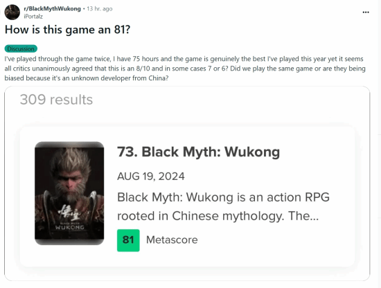 近日,《黑神话:悟空》的媒体评分引起了网友的关注。一位名为iPortalz的网友在游戏专区发表了一篇质疑文章,表示该游戏的平均评分为81分,而自己已经玩了75个小时,认为这是今年最好的游戏之一。
