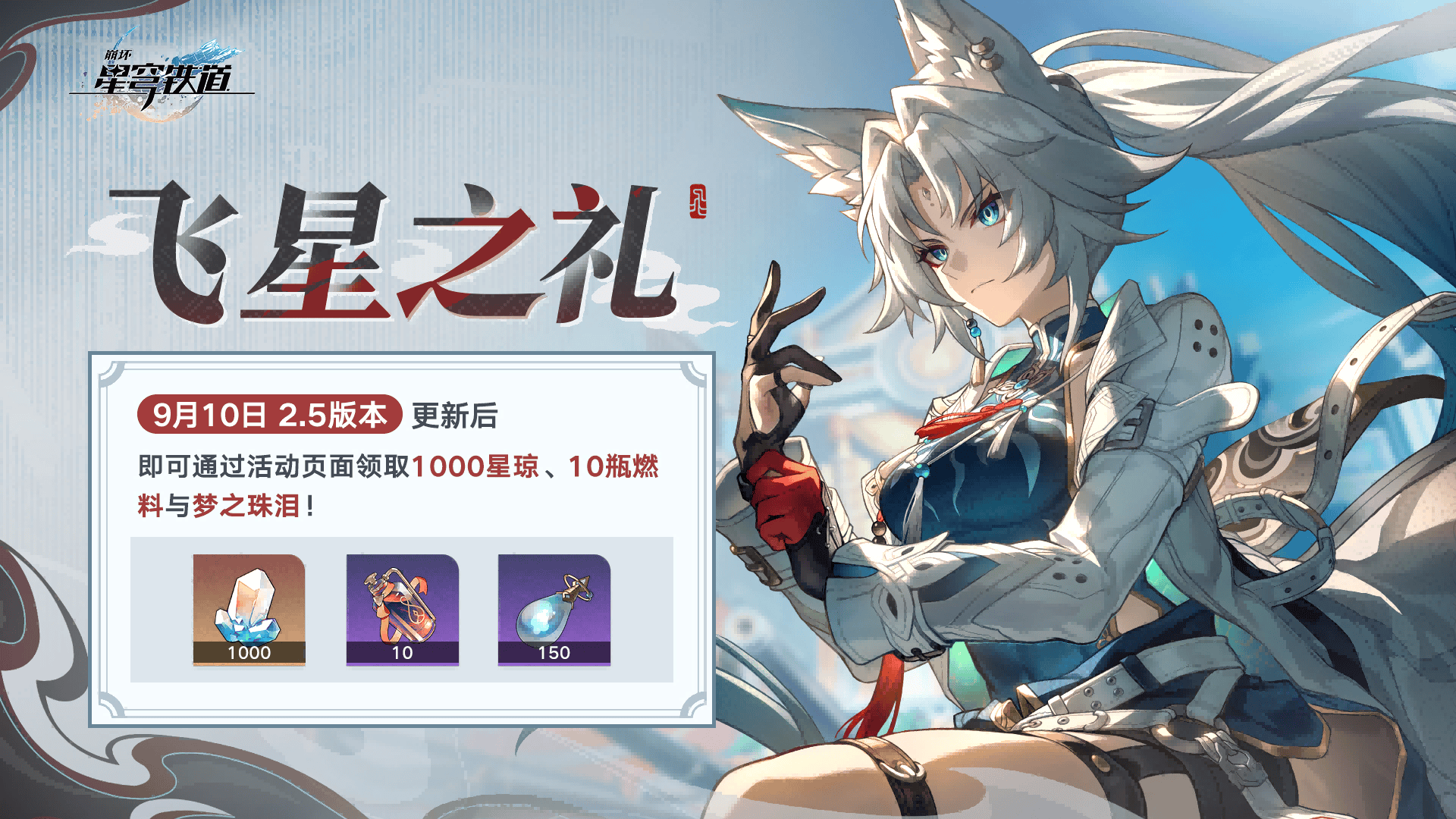 而同样作为一名白毛控的我,对这次《崩坏:星穹铁道》在2.5版本中正式登场的新角色——来自曜青仙舟的白毛狐族女战士,帝弓七天将中享有武魁美名的“天击将军”飞霄,自然也是毫无抵抗力。除了白毛加狐耳的特征很合我的审美外,这位天击将军还在2.5版本“碧羽飞黄射天狼”的更新中,直接大方豪爽地给所有《崩坏:星穹铁道》的玩家们,在十张专票的基础上额外赠送了份价值1000星琼的“飞星之礼”。如此懂得体恤玩家的将(老)军(婆),试问又有哪位开拓者不愿为其赴汤蹈火?
